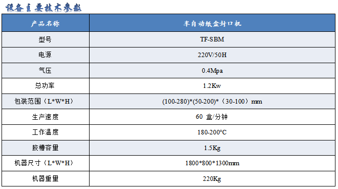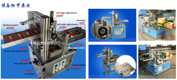 2.人工装好物料放至输送带,机械自动上胶、封口,大小规格可调节;3.机器使用胶量大约是手工封盒胶的1/3,胶水使用量极少;