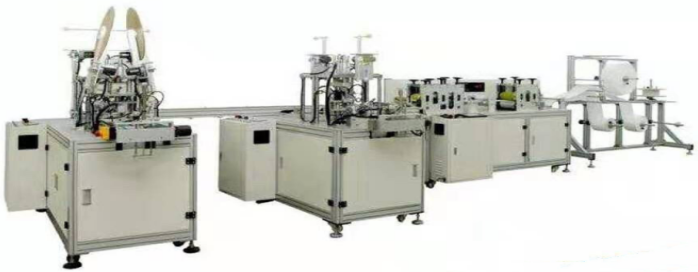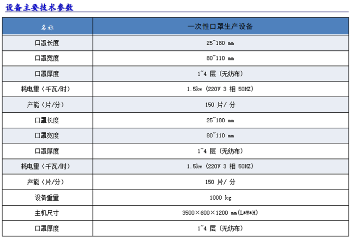 1)本机可生产1--4层无纺布本体口罩。规格可调,口罩厚度在一定范围内可调,鼻梁线长度任意可调,在更换模具的情况下可生产任意长度的非标准的口罩,可以生产单、双鼻线的口罩。包线橡皮筋放置在输送带盒内,口罩两端的橡皮筋自动输送剪切,焊接牢固,一次性由机器完成点带的设备,产量高,废品率低,容易操作,外观采用铝合金结构;